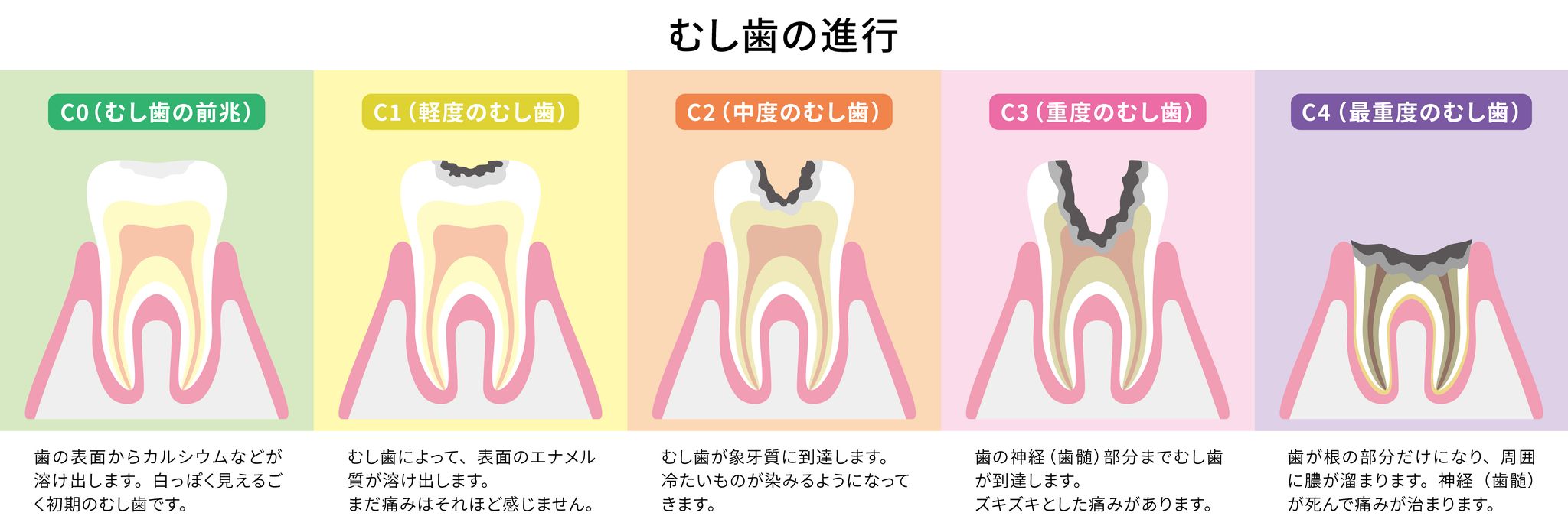 むし歯の治療は、進行度によって方法が大きく異なります。一度歯を削ると、歯を削る前の状態には戻りませんので、早期発見・早期治療が、歯を守るためにとても重要です。