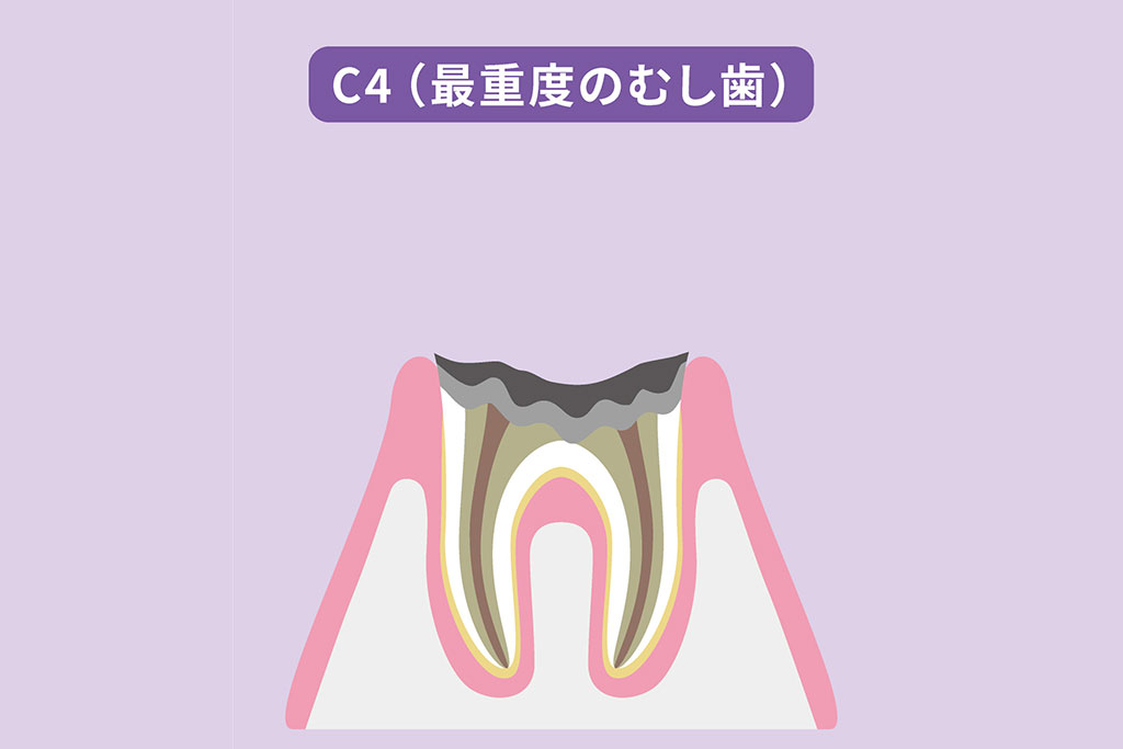 むし歯が進行しすぎて、歯のほとんどが崩壊している状態です。歯の神経もダメージを受けているため、むし歯による痛みも感じなくなります。